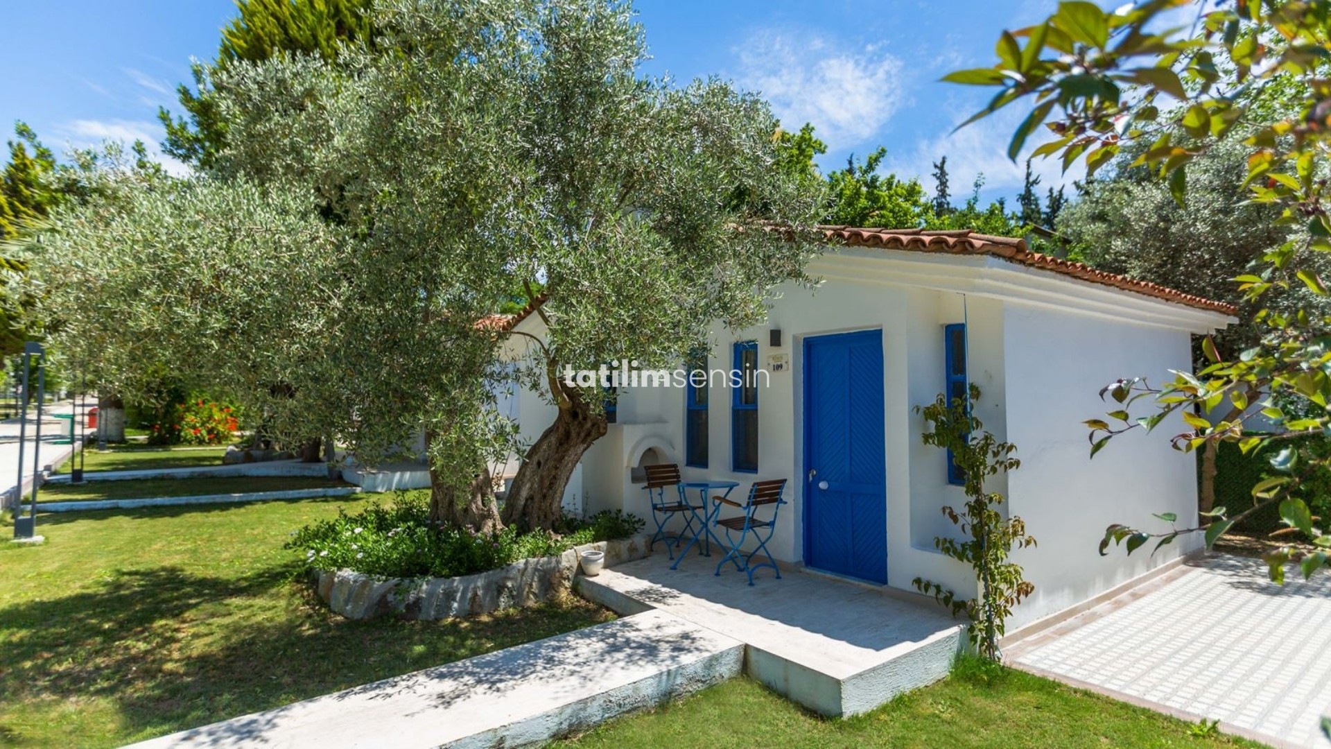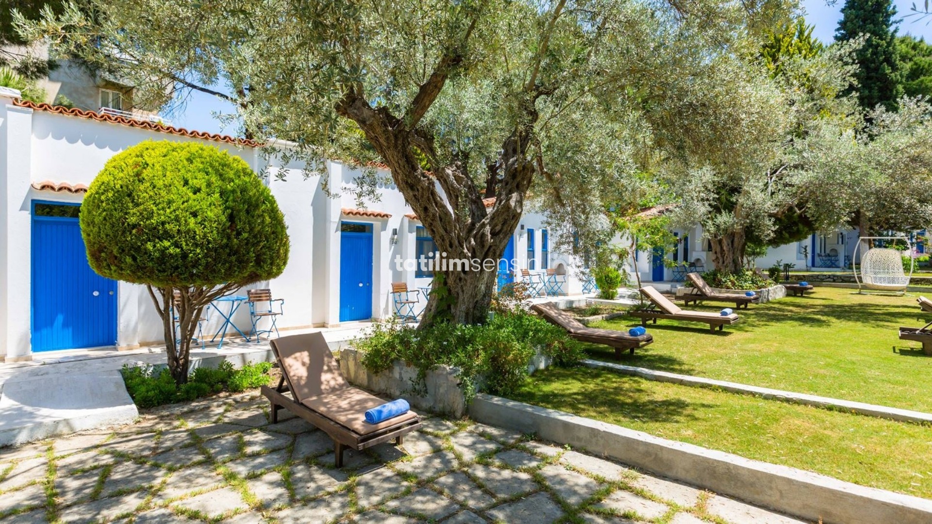 Odalar, bahçe içinde tek katlı sevimli yapılar halinde tasarlanmış. Doğayla iç içe, samimi ve huzurlu bir atmosfer sağlıyor.