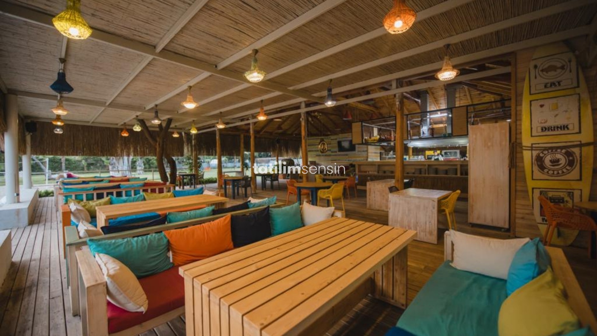 Renkli dekora sahip plaj bar ve restoranda ekstra yiyecek & içecek hizmeti alabilirsiniz.